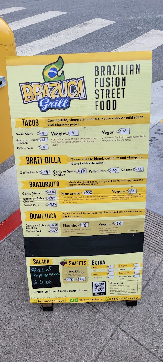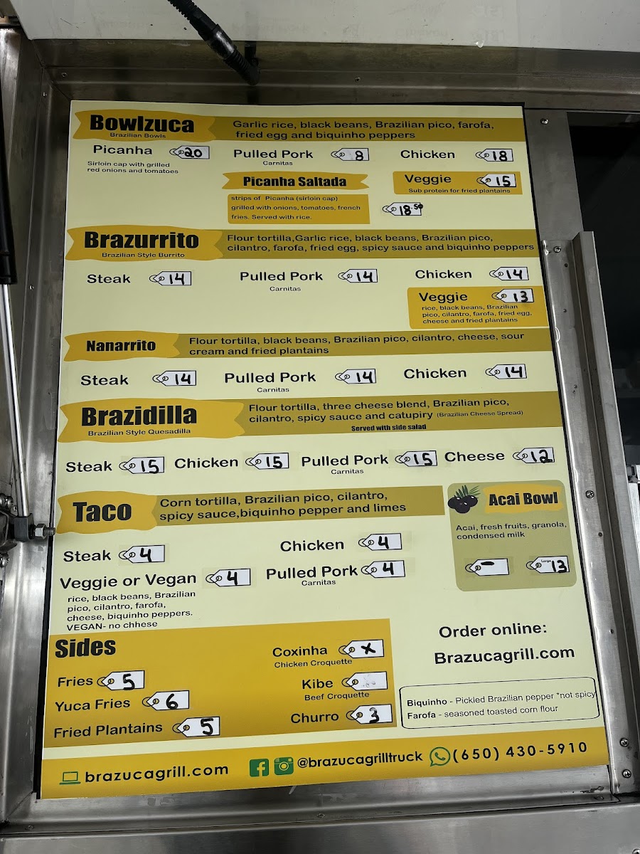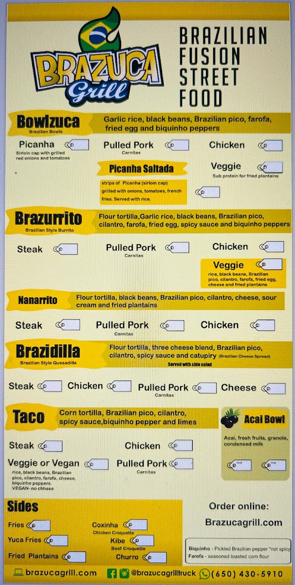 Brazuca Grill offers a diverse and flavorful menu that brings the taste of Brazil to San Francisco. The Bowlzuca options are a highlight, featuring classic Brazilian dishes like Picanha and Picanha Saltada, perfect for meat lovers seeking an authentic experience. Alongside these, you can enjoy a variety of tempting Sides, including Fries, Yuca Fries, and the deliciously sweet Fried Plantains. The restaurant also offers tasty appetizers like Coxinha and Kibe, adding a savory touch to your meal. For something a bit different, try the Nanarrito-a unique twist on the burrito, or the hearty Steak and Pulled Pork dishes. Vegans and vegetarians aren’t left out, with the flavorful VeggieAcai Bowl providing a refreshing and healthy option. Each dish is prepared with care, bringing a rich combination of flavors that are sure to satisfy any craving. Whether you're in the mood for something hearty or light, Brazuca Grill has something to suit all tastes.